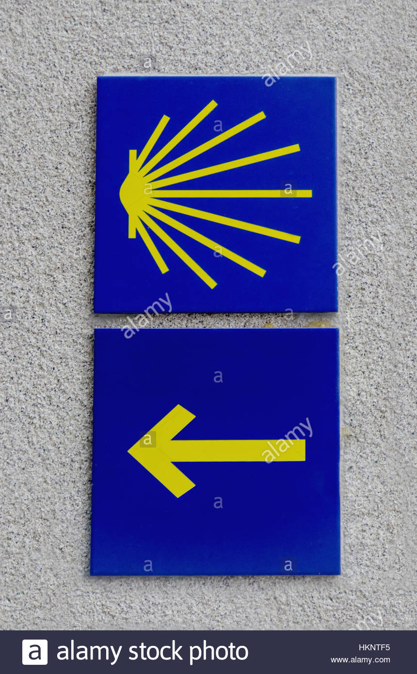 Letreros En El Camino De Santiago De Compostela Concha Y Flecha Amarilla Con Fondo Azul En Una Pared Camino De Santiago Waymarker Fotografia De Stock Alamy