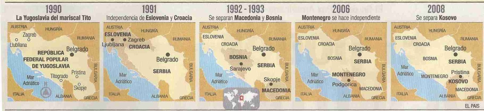 Desintegracion mapa de yugoslavia. Sin embargo estas no serían ni las únicas ni las últimas escisiones traumáticas de Yugoslavia El país, ya descompuesto, pasó a llamarse Serbia y Montenegro en 03, pero su integridad y nombre apenas duraría tres años, ya que en 06 y tras un referéndum pactado de independencia, Montenegro pasaba a convertirse en un nuevo Estado Desde entonces el país ha tratado de mirar hacia la. El efecto dominó que en una década conducirá a la desintegración de Yugoslavia tiene su origen en la secesión pacífica de Eslovenia de 1991, inmediatamente y unilateralmente reconocida por Alemania y el Vaticano La primera para ampliar la zona económica de influencia de su moneda, ni siquiera consultó a sus aliados europeos;. CAUSAS DE LA DESINTEGRACIN DE YUGOSLAVIA * COLAPSO ECONMICO Yugoslavia para la poca de 1960 era una nacin de gran poder industrial, su nivel de vida era promediado, la educacin era gratuita y su economa era fuerte y prospera Pero despus de un tiempo de mala administracin econmicamente Yugoslavia decay Yugoslavia se consideraba como estado colchn ya que se encontraba en medio del occidente y.