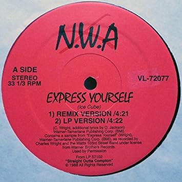 Or they ban my group from the radio Hear NWA and say hell no!. "Express Yourself" was written by Charles Wright and performed by Charles Wright & the Watts 103rd Street Rhythm Band It became their signature song after its release in 1970 on their album, Express Yourself The song was produced by Wright It reached #12 on the Billboard Hot 100 and was also their biggest hit on the US R&B chart, reaching #3 The single was nominated for the Grammy Award for Best R&B Performance by a Duo or Group with Vocals in 1971, losing to The Delfonics song "Didn't I ". Language (s) English © 15 Priority Records Listen to NWA Express Yourself MP3 song Express Yourself song from the album Straight Outta Compton is released on Aug 15 The duration of song is 0423 This song is sung by NWA Related s Express Yourself, Express Yourself Song, Express Yourself MP3 Song, Express Yourself MP3, Download Express Yourself Song, NWA Express Yourself Song, Straight Outta Compton Express Yourself Song, Express Yourself Song By NWA, Express.