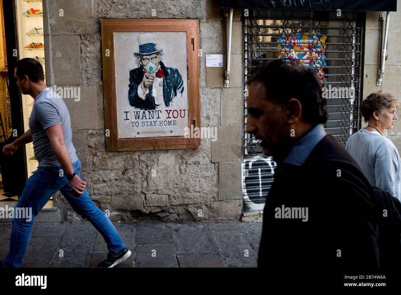 Barcelona Catalonia Spain 15th March Downtown Barcelona A Street Art Paint Representing Uncle Sam Wearing A Protective Face Mask As It Reads I Want You Stay Home In Reference To The