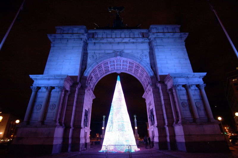 Two Decades on, Grand Army Plaza Gets Its Iconic Arch Twenty years after the completion of Olmstead and Vaux’s designs, the architecture firm McKim, Mead and White undertook reconstruction plans for the plaza, adding an imperial arch inspired by Roman military archways. The dedication of the arch took place on October 21, 12 and was attended by President Grover Cleveland who spoke at the ceremony Designed in homage to the Arc de Triomphe in Paris, France, the Soldiers’ and Sailors’ Arch stands in Grand Army Plaza at eighty feet in both height and width, its archway fifty feet tall and thirty feet wide. The sculpture sits in place of the traditional Nativity creche in front of the historic Soldiers and Sailors Memorial Arch The 35foot tree is adorned with 14,000 lights, making an impressive.