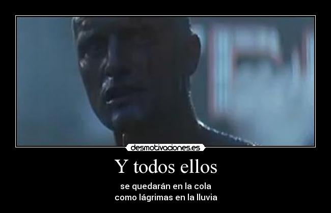 Blade Runner aparece regularmente, dos o tres veces al año en diversas figuras y formas de ciencia ficción Estableció el ritmo para lo que es esencialmente ciencia ficción urbana, futuro urbano y es por eso que nunca he visitado nuevamente esa zona porque siento que lo he hecho. Grandes frases y citas memorables aparecidas en películas y dichas por la gente del cine, como actores, actrices, directores, guionistas y productores Vota las frases para elegir a las mejores y peores frases de la historia del cine. "It looks fabulous, it uses special effects to create a new world of its own, but it is thin in its human story" This seems a strange complaint, given that so much of the movie concerns who is, and is not, human, and what it means to be human anyway Even one character we can safely assume is human, the reptilian Tyrell, czar of the corporation.