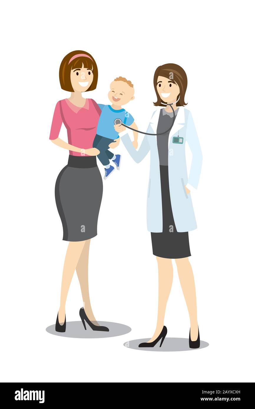 Doctor Caucasico Que Escucha El Pecho Del Nino Paciente Con Estetoscopio La Madre Sostiene Al Hijo En Sus Brazos Ilustracion Vectorial De Dibujos Animados Imagen Vector De Stock Alamy
