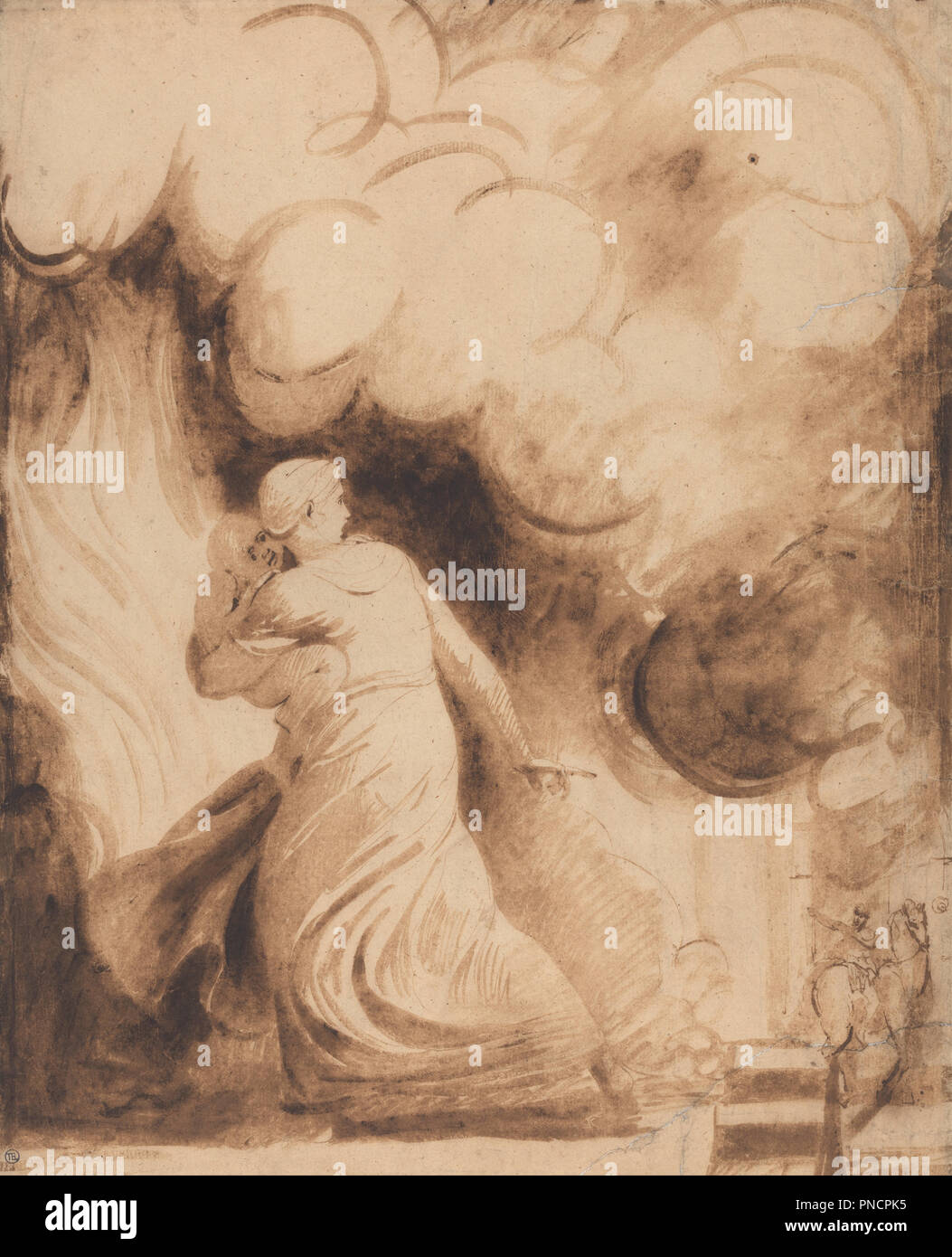 Una Madre Con Su Hijo En Brazos Volando Sobre Las Murallas De Una Ciudad En Llamas