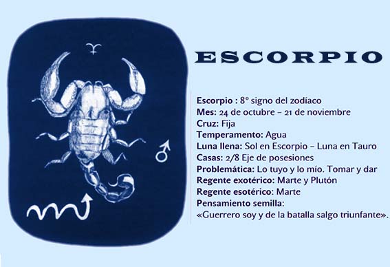 Escorpio signo de agua. Se considera que alguien es del signo Escorpio cuando nace entre el 23 de octubre y el 22 de noviembre 3 Pertenece, junto a Piscis y Cáncer, al elemento agua, 4 y es uno de los cuatro signos de naturaleza fija del zodiaco junto a Tauro, Leo y Acuario 5 Su signo opuesto y complementario a la vez es Tauro 6. Parte del cuerpo los órganos genitales ;. Escorpio (23 octubre 22 noviembre) En las divisiones zodiacales le corresponde ser un signo fijo, de agua y negativo Escorpio es el signo más controvertido y también el más apasionante del Zodíaco, debido a la complejidad de su psicología.