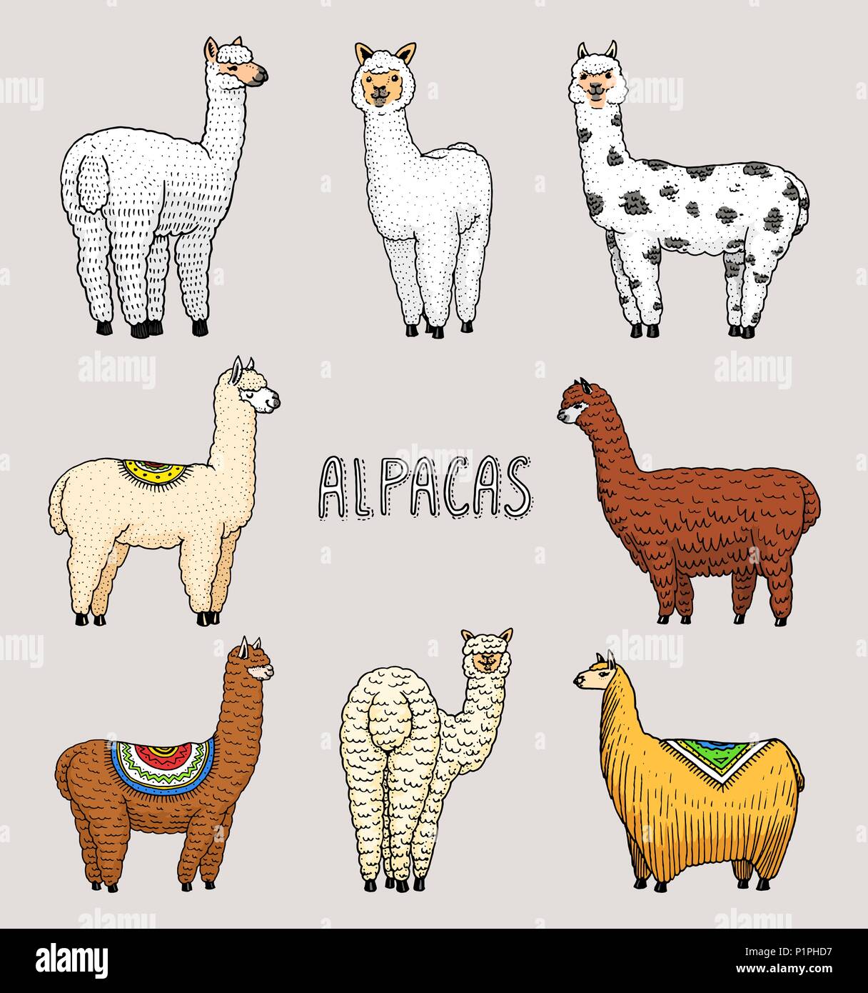 Set Of Cute Alpaca Llamas Or Wild Guanaco On The Background Of Cactus And Mountain Funny Smiling Animals In Peru For Cards Posters Invitations T Shirts Hand Drawn Elements Engraved Sketch Stock Vector