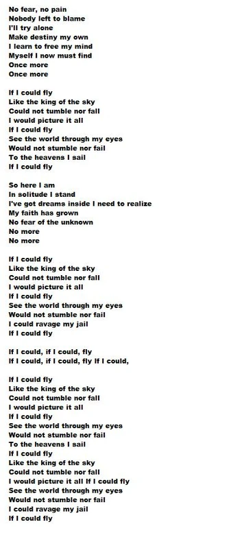 If I could fly Even the imagination of having wings is carrying me to the world of fantasy It seems, I’m a wonderful part of the heavenly world, being admired by all my friendly creatures on the earth If I could fly, I would race with the birds, the flight of which had always been wondered by me. If I Could Fly Lyrics Mina / They'll drive a stake through the heart of the monster / Why do I feel a growing compulsion to save him?. If I Could Fly Lyrics No fear, no pain, nobody left to blame / I'll try alone, make destiny my own / I learn to free my mind / Myself I now must find / Once more, once more / If I could fly like the.