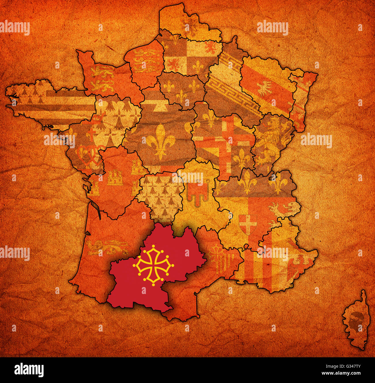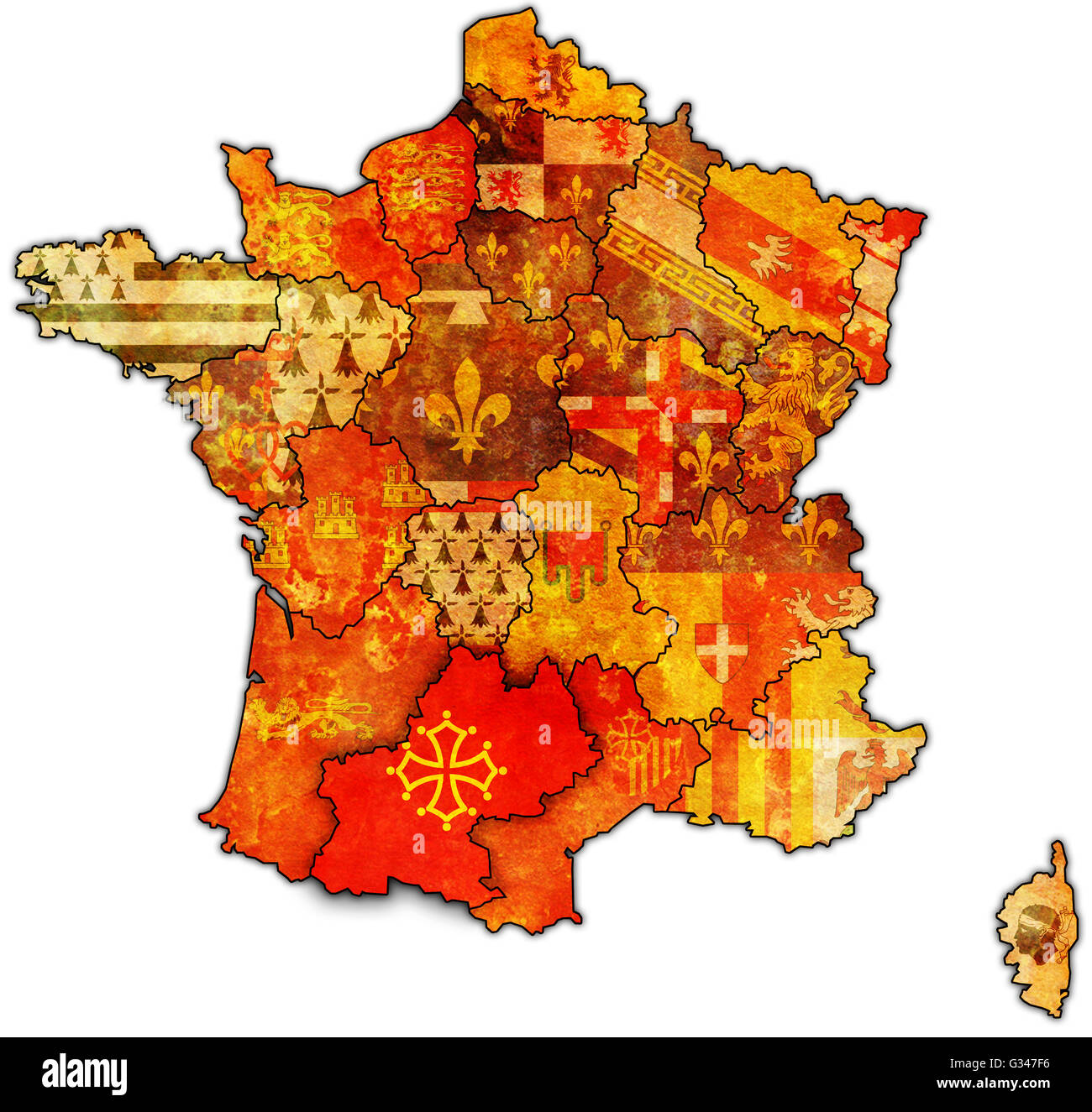 En Midi Pyrenees Viejo Mapa De Francia Con Banderas De Divisiones Administrativas Fotografia De Stock Alamy