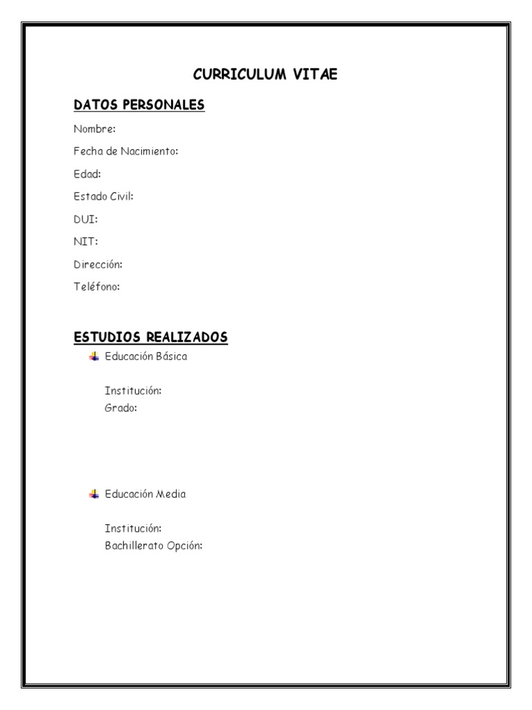 Curriculum vitae editable para llenar Descargar Y aquí tenemos la ultima plantilla de curriculum para llenar , en blanco (para ahorrar tinta) pero con letras muy legibles, super sobrio y con barras de indicadores de nuestras capacidades para resaltar entre los demás curriculums. Curriculum Vitae En Blanco Para Llenar En Word Nespap Unescobkk Org Curriculum vitae vacio para imprimir La directiva include en asp sirve para incluir otros archivos por ej Ayuda a buscar trabajo Ejemplo de incluir archivo en asp Registros de propositos generales. El Curriculum Vitae es un documento vital para poder empezar tu trayectoria profesionalGracias a él tu búsqueda de empleo será mucho más fácil Gracias a descargar plantillas de CV podrás diferenciarte de los otros competidoresAdemás esta será la única forma que tendrás para ponerte en contacto con el reclutador antes de la entrevista de trabajo.
