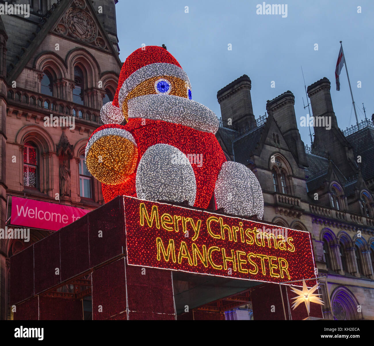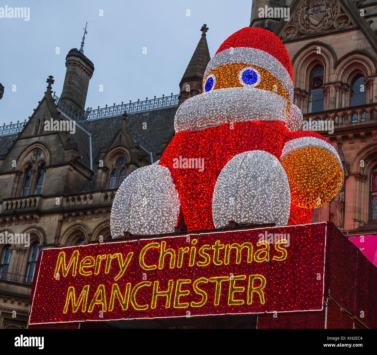Manchester Town Hall With Merry Christmas Manchester Zippy Santa Claus Stock Photo Alamy
