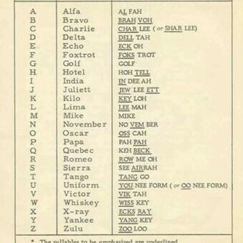 Todos esos términos son parte del alfabeto fonético Si alguna vez has tenido que usar una radio para comunicarse, o incluso un teléfono, usted sabe que algunas veces las cartas no son claras, y el ejército descubrió esto así, por lo que desarrollaron una forma estandarizada de enunciar las cartas sobre los sistemas de comunicación en su esencia lo mismo que decir “s como en sam. Alfa, Bravo, Charlie, Delta Alfabeto Radiofónico By Manuel Heineken marzo 21, 18 Facebook Twitter WhatsApp El alfabeto radiofónico o alfabeto fonético OACI, es un lenguaje utilizado internacionalmente en radiocomunicaciones de transmisiones de voz tanto marítimas como en la aviación, servicios militares y. The Allied military phonetic spelling alphabets prescribed the words that are used to represent each letter of the alphabet, when spelling other words out loud, letterbyletter, and how the spelling words should be pronounced for use by the Allies of World War IIThey are not a "phonetic alphabet" in the sense in which that term is used in phonetics, ie they are not a system for.