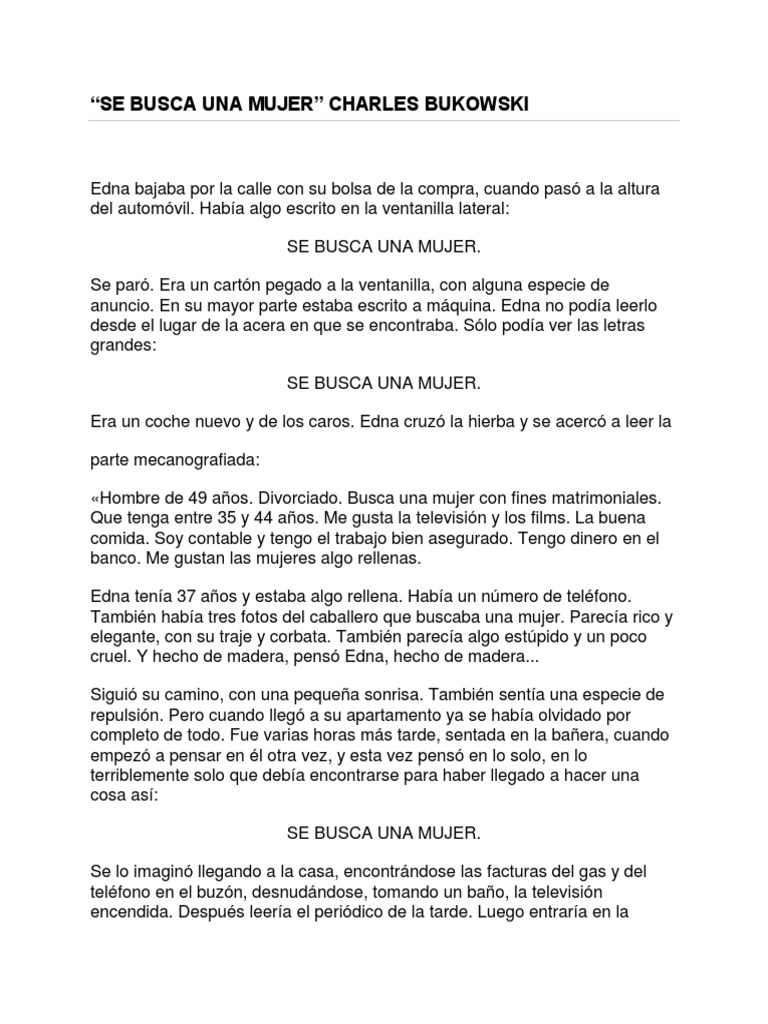 Charles Bukowski murió en San Pedro el 9 de marzo de 1994 Sinopsis de la obra En Mujeres, el alter ego de Bukowski, Henry Chinaski , el » viejo indecente «, un perdedor nato, se encuentra a los cincuenta años con una creciente reputación literaria, algún dinero en el banco y mujeres montañas de mujeres. Irreverente, así se describe el estilo de Charles Bukowski considerado un gran literario de la mala vida de Los Ángeles La mayoría de sus libros son autobiográficos, basados en sus experiencias de la niñez, juventud y de adulto, a través de Henry Chinaski, personaje que llegó a posicionarse como su alter ego y que usaba con frecuencia para narrar sus propias vivencias con un lenguaje. Hombre de 49 años Divorciado Busca una mujer con fines matrimoniales Que tenga entre 35 y 44 años Me gusta la televisión y el séptimo arte La buena comida Soy contable y tengo el trabajo bien asegurado Tengo dinero en el banco Me gustan las mujeres algo rellenas Edna tenía 37 años y estaba algo rellena Había un número de.