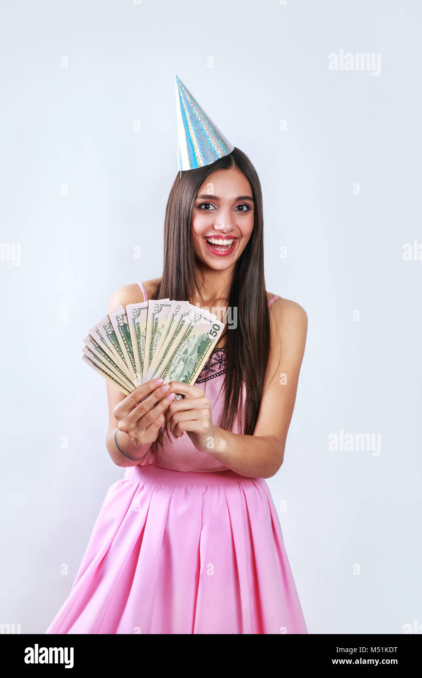 Feliz Cumpleanos Mujer Con Dinero Joven Y Bella Mujer Feliz Cumpleanos En Celebracion Wad De Dinero Efectivo Celebrando La Fiesta De Vacaciones Sobre Fondo Blanco Fotografia De Stock Alamy