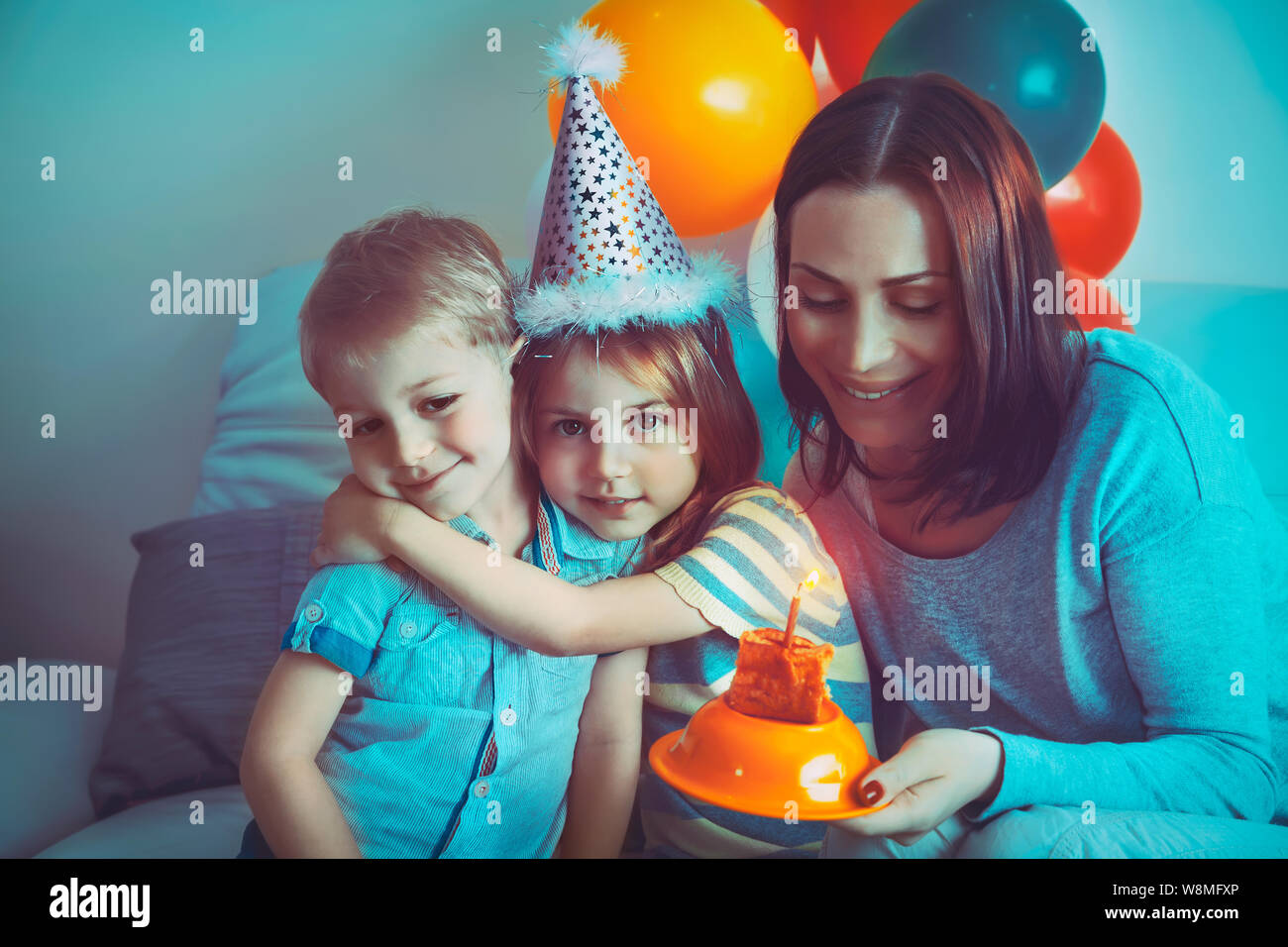 Familia Feliz Celebrando Un Cumpleanos Chico Con Mom Felicitando A Su Hermana Con Torta De Cumpleanos Disfrutando De Fiestas Y Muchos Globos De Colores Fotografia De Stock Alamy