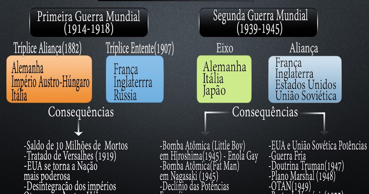 A Europa se transformou em um grande barril de pólvora O que desencadeou a Primeira Guerra Mundial foi o ataque ao arquiduque Francisco Ferdinando, herdeiro do trono austríaco, que aconteceu na capital da Bósnia A Áustria acusou a Sérvia de planejar o atentado e isso resultou em uma troca de tiros em 1914 Posteriormente, a Rússia declarou guerra à Áustria, a Alemanha declarou. Buscar en este sitio 1 Bienvenidos 2 Países que participan y bloques. A Segunda Guerra Mundial é um evento traumático para a sociedade moderna, seja ela oriental ou ocidental Esse evento bélico de proporções impressionantes ocorreu principalmente devido a fatores iniciados muito antes de 1939 A partir do mapa conceitual, é possível discorrerse sobre o expansionismo alemão e o objetivo econômico e.