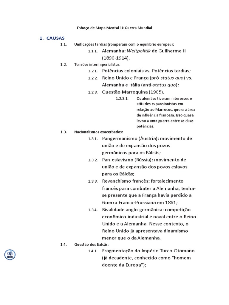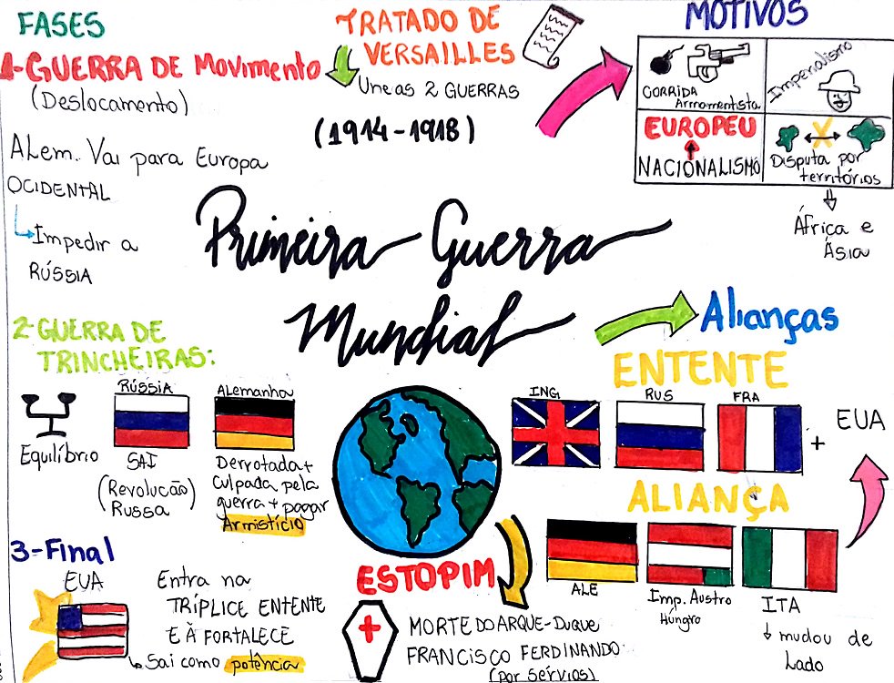 Passo a passo para construir um mapa mental 1 Com o papel e caneta em mãos ou com o programa de mapa mental aberto, escreva no centro da folha a ideia central A partir da ideia central, puxe flechas para as informações associadas ao tema Por exemplo, se você está estudando sobre a Primeira Guerra Mundial, pode colocar como primeiras. Guerra Mundial Primeira Guerra Mundial 1º CausasHavia uma forte concorrência comercial entre os países europeus,principalmente na disputa pelos mercados consumidores. Entenda as causas, consequências, combatentes e fases da Primeira Guerra Mundial, além de conferir um resumão do assunto, um mapa mental e uma videoaula Não perca!.