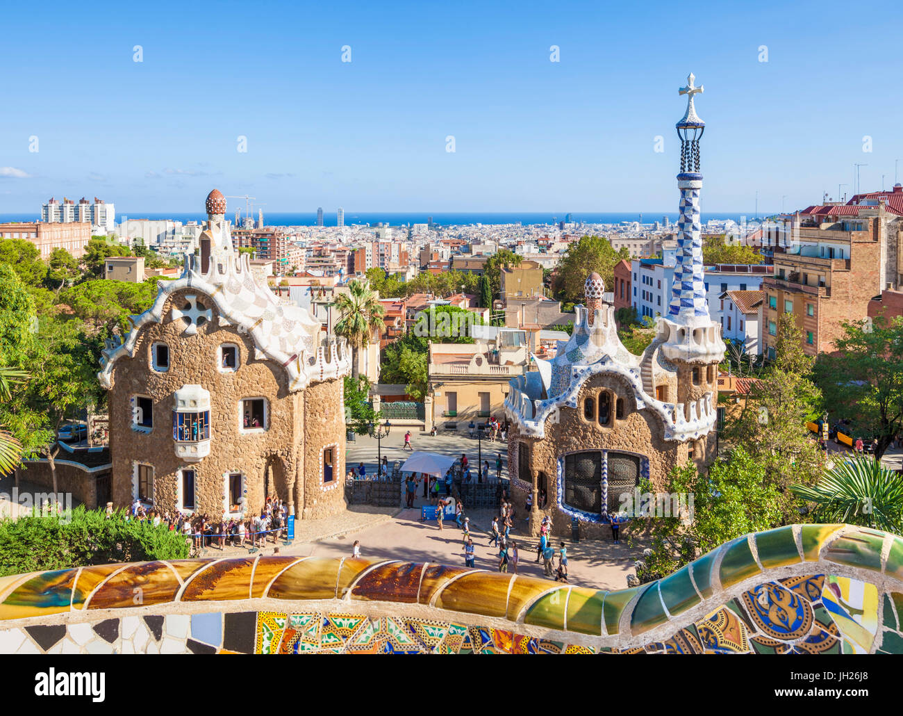 Park Guell Houses And Mosaic Tiles At Parc Guell By Antoni Gaudi Unesco World Heritage Site With Views Over The City To The Sea Barcelona Cataloni Stock Photo Alamy