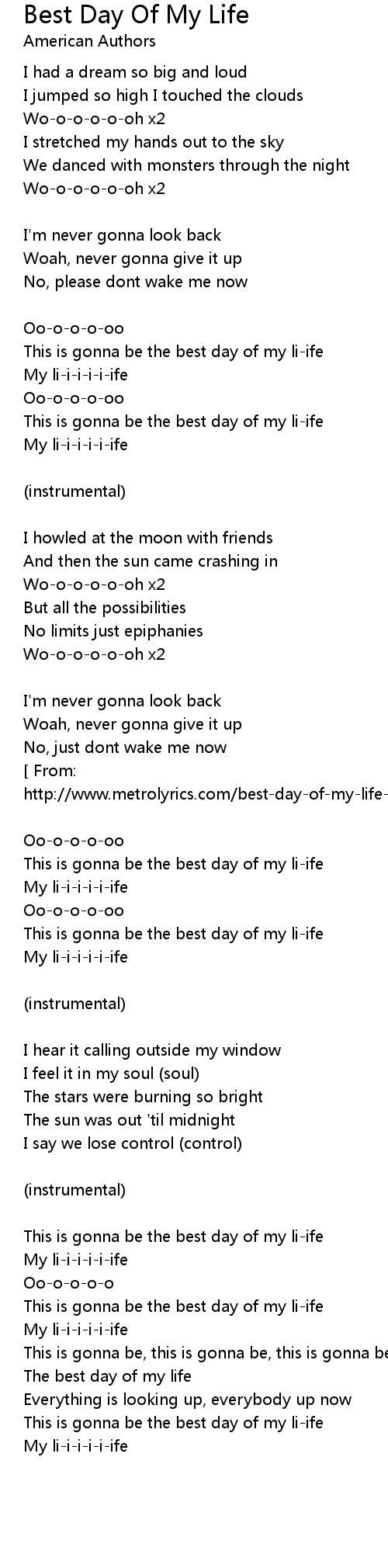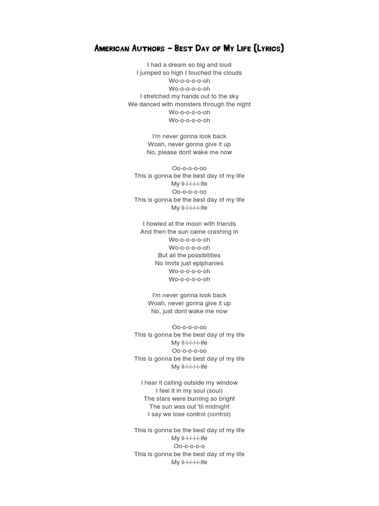 I had a dream so big and loud I jumped so high I touched the clouds Wooooooh, wooooooh I stretched my hands out to the sky We danced with monsters through the night Wooooooh, wooooooh I'm never gonna look back Woah, never gonna give it up No, please don't wake me now This is gonna be the best day of my life My liiiiiife This is gonna be the best day of my life My lii. Original lyrics of Best Day Of My Life song by America Authors Explain your version of song meaning, find more of America Authors lyrics Watch official video, print or download text in PDF Comment and share your favourite lyrics. Listen to Best Day Of My Life by American Authors, 6,985,912 Shazams, featuring on Pop Hits 13, and Inspirational Songs Essentials Apple Music playlists.