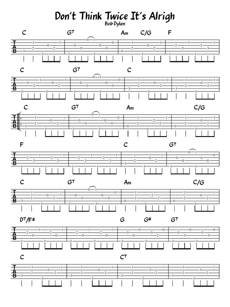Don't Think Twice, It's All Right Bob Dylan Free, easytoread guitar chords, tabs (tablature), lyrics, sheet music, and lessons from Heartwood Guitar Instruction. Intro C G Am F C G C G Am It ain't no use to sit and wonder why, babe F C G If you don't know by now C G Am An' it ain't no use to sit and wonder why, babe D7 G G7 It'll never do somehow C C7 When your rooster crows at the break of dawn F D7 Look out your window and I'll be gone C G Am F You're the reason I'm trav'lin' on C G C But don't think twice, it's all right G Am F C G C G Am It ain't. Intro C G Am F C G C G Am It ain't no use to sit and wonder why, babe F C G If you don't know by now C G Am An' it ain't no use to sit and wonder why, babe D7 G G7 It'll never do somehow C C7 When your rooster crows at the break of dawn F D7 Look out your window and I'll be gone C G Am F You're the reason I'm trav'lin' on C G C But don't think twice, it's all right G Am F C G C G Am It ain't.