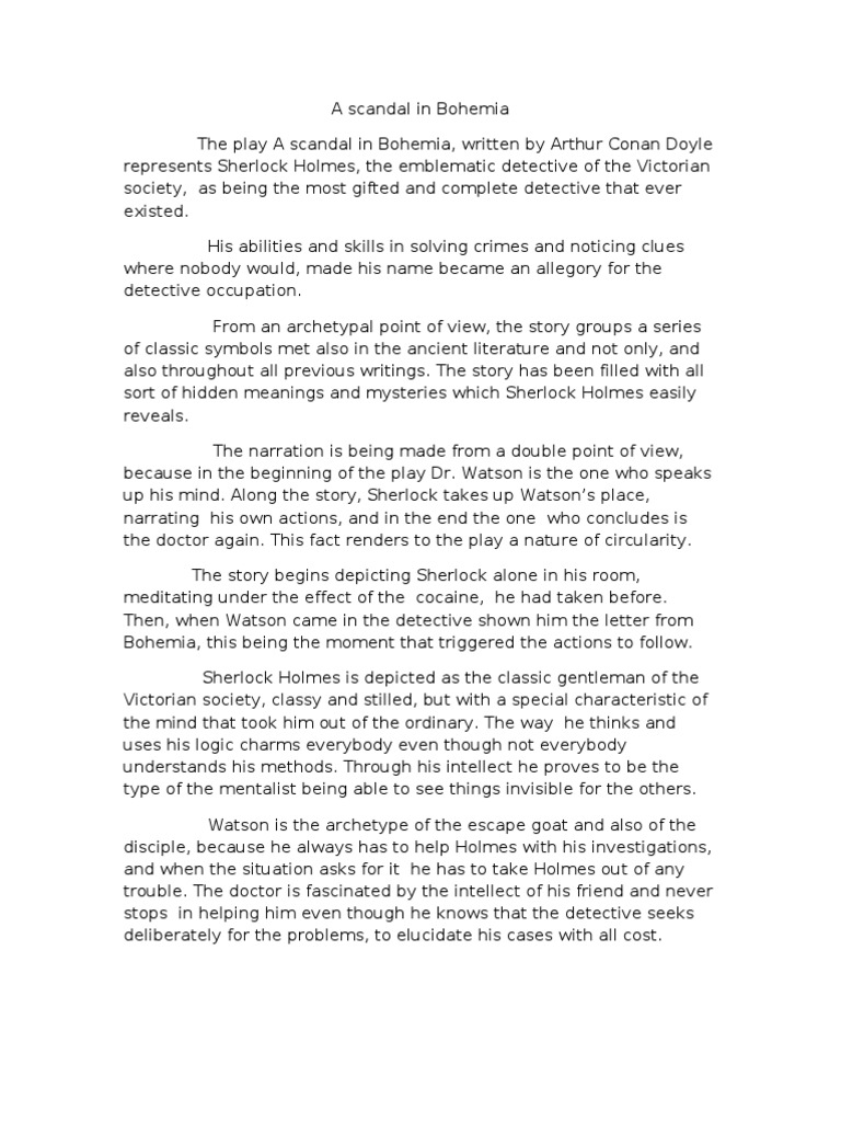 "To Sherlock Holmes she is always ’the woman’" So begins "A Scandal in Bohemia," the first story in the collection Irene Adler is "the" woman because she is the only person ever to have outwitted Holmes The King of Bohemia fears that he will be blackmailed by Adler, his former lover, who has kept some compromising love letters and a photograph However, she manages to turn the tables on the detective, retaining the photograph to ensure her own safety. A short summary of this paper 37 Full PDFs related to this paper Kitipong Metharattanakorn “A Scandal in Bohemia” Analysis Sir Arthur Conan Doyle’s “A Scandal in Bohemia” was the first of 56 short stories written to be published in The Strand Magazine It was first published in July 11 in the issue of the magazine, and the following year, was the first of the stories collected in The 1 Adventures of Sherlock Holmes in 12. “A Scandal in Bohemia” is the first short story by Sir Arthur Conan Doyle featuring his now iconic character Sherlock Holmes It was published in 11 and is also well known for introducing the character of Irene Adler, a woman who becomes a romantic interest for Holmes in later works The story begins with a married Watson paying Holmes a visit.