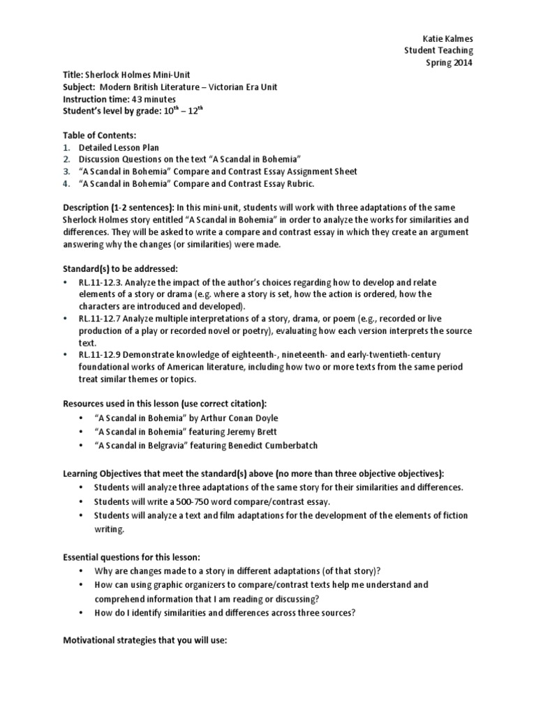 Standard 5 Mini Unit On Sherlock Holmes A Scandal In Bohemia Sherlock Holmes