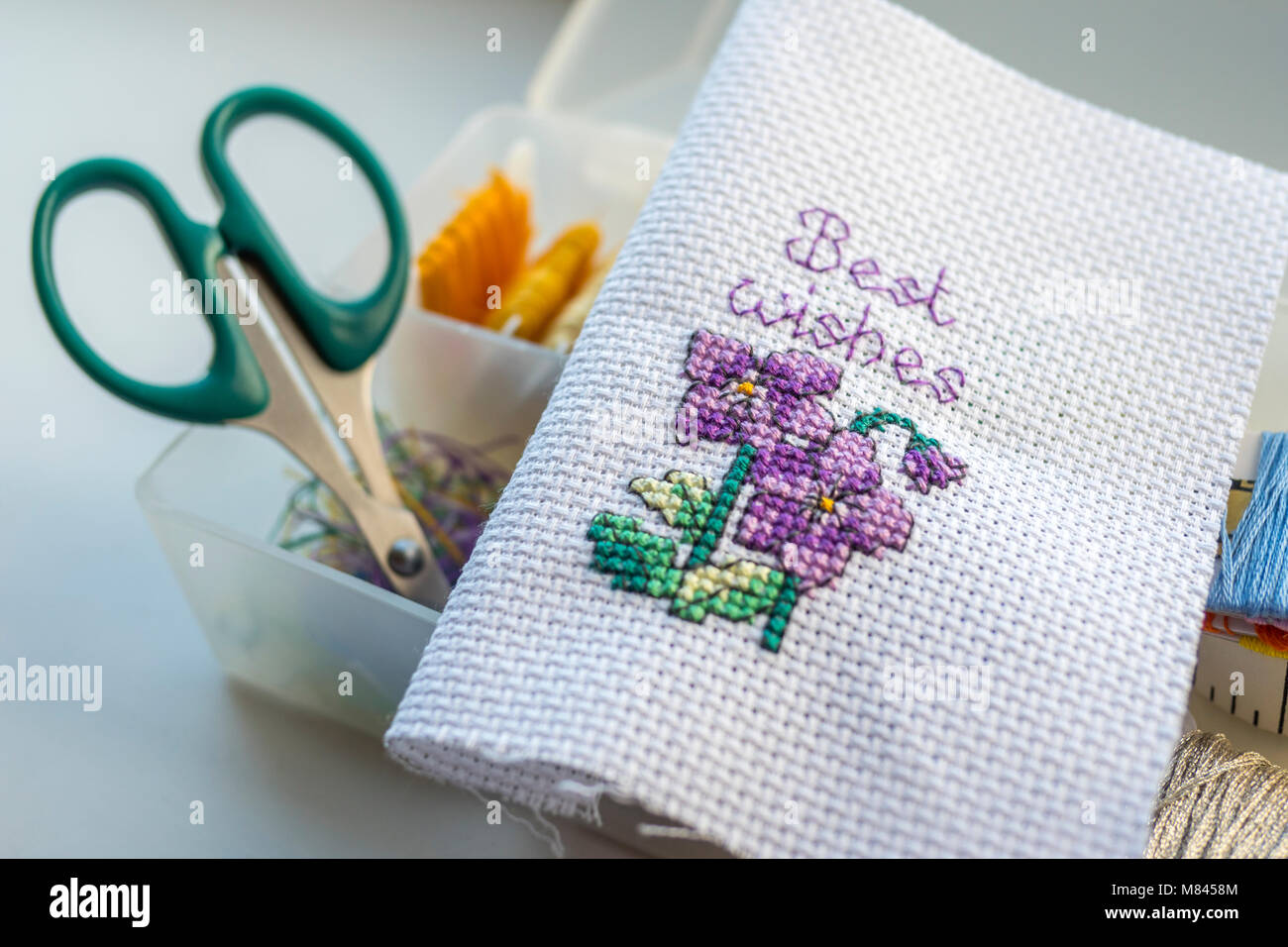 Hilos Para Bordar Punto De Cruz En Una Caja De Almacenamiento Con Acabado De Cruz Hecha En Una Tarjeta Fotografia De Stock Alamy
