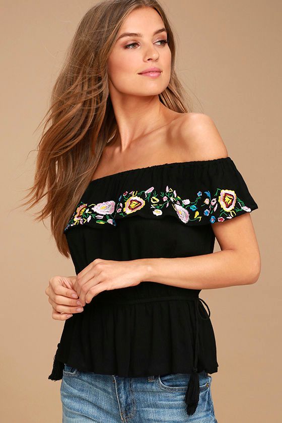 Boho Black Top Embroidered Top Off The Shoulder Top 42 00 Lulus