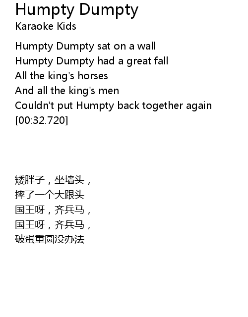 Original lyrics of Humpty Dumpty song by Children 1 user explained Humpty Dumpty meaning Find more of Children lyrics Watch official video, print or download text in PDF Comment and share your favourite lyrics. Usually represented by an egg, “Humpty Dumpty Lyrics” is a famous character in an English nursery rhyme It also appears in literature works and other popular culture such as Through the LookingGlass, by Lewis Carroll, Mother Goose in Prose by L Frank Baum, The Hollow Chocolate Bunnies of the Apocalypse by Robert Rankin, and the Jasper Fforde’s novels The Well of Lost Plots and The Big. Lyrics to Humpty Dumpty by The Countdown Kids from the Die 25 Beliebtesten Englischen Kinderlieder Aller Zeiten album including song video, artist biography, translations and more!.