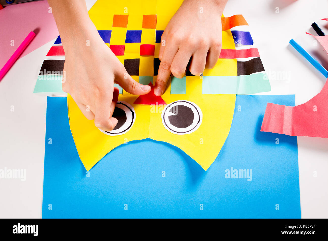 Nino Haciendo Manualidades Con Papel Boy Hand Gripado Del Buho Coloridas Hechas De Papel De Color Fotografia De Stock Alamy