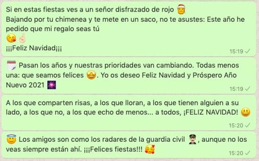 Las mejores felicitaciones para enviar por Whatsapp Hoy, 24 de diciembre se celebra la Nochebuena, el inicio de la Navidad. Desde Events Marketing Group os felicitamos las fiestas con este video de felicitación original de Navidad / 21 Envíalo por WhatsApp si quieres util. Felicitaciones de Navidad graciosas en TOP Que en el nuevo año 21 encuentres dinero, amor, salud y felicidad Y, si alguna de estas cosas no la encuentras, siempre puedes buscarla en Google Los amigos son como los radares de tráfico aunque no los veas, sabes que siempre están ahí.