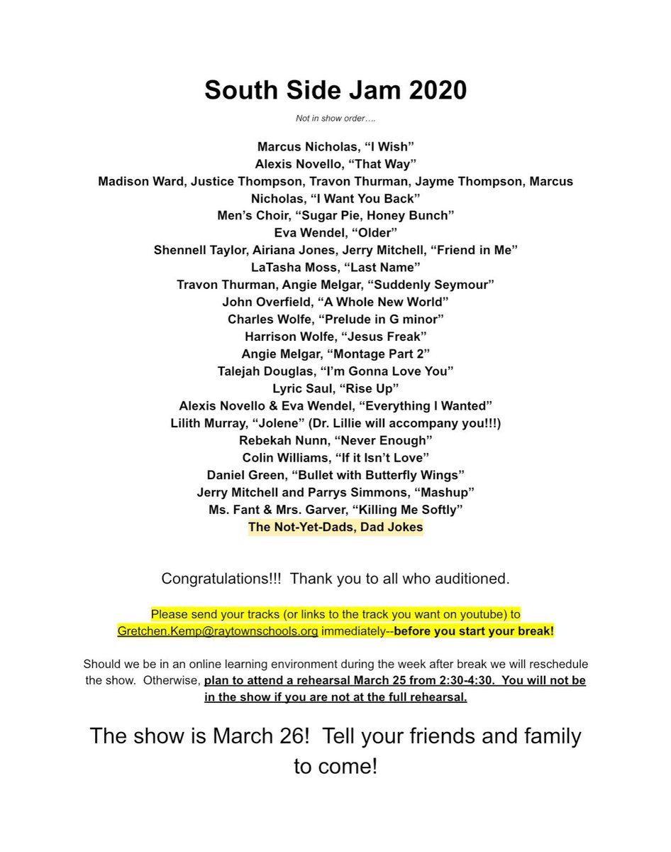 Rqssouthhigh Congratulations To Those In South Side Jam We Will Keep An Eye On Covid 19 And Reschedule If Needed Send Your Tracks In To Kemp Immediately T Co Uedh5bwbid