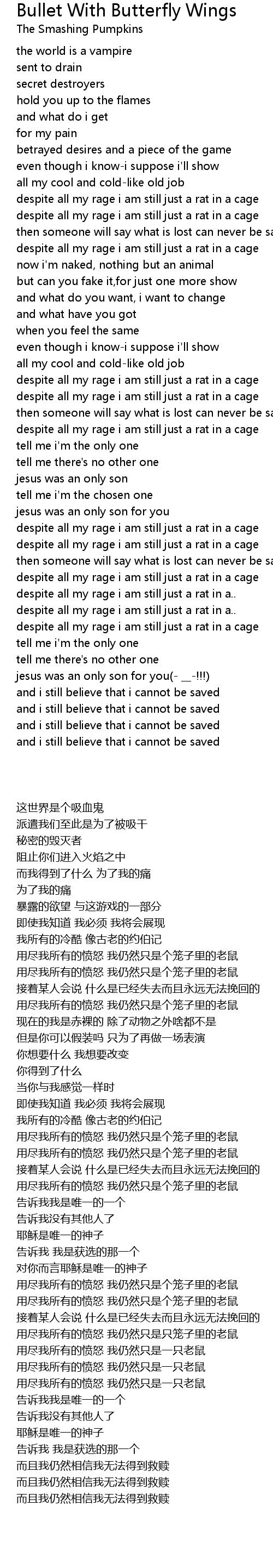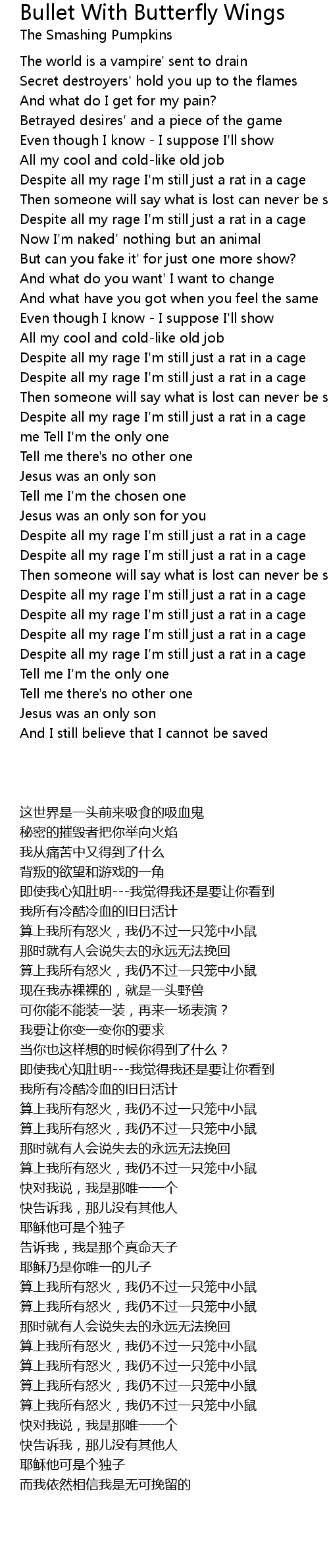 Lyrics to 'Bullet With Butterfly Wings (Sadlands Demo)' by The Smashing Pumpkins. The world is a vampire sent to drain secret destroyers hold you up to the flames and what do i get for my pain betrayed desires and a piece of the game even though i know-i suppose i'll show all my cool and cold-like old job despite all my rage i am still just a rat in a cage despite all my rage i am still just a rat in a cage then someone will say what is. The Lyrics for Bullet With Butterfly Wings by The Smashing Pumpkins have been translated into 11 languages.