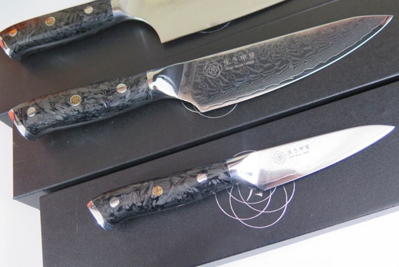 33layer of Stainless Steel SUS430&SUS431 on each side;. The Damascus steel Knife is made of 67 layers of damascus The steel core adopts Japanese VG10, nonslip G10 handle, with high sharpness, corrosion Resistance, rust prevention and toughness which is very suitable for people who often cook or like the kitchen And Suitable as a gift for friends and family. Sakai Takayuki 33 Layer Damascus Gyuto 210mm, Santoku 180mm, and Petty 150mm Japanese Kitchen Chef Knives Set $ USD Iseya Molybdenum Steel Petty Japanese Chef Knife 1mm & Gyuto Knife 180mm with Mahogany Handle Set $9300 USD.