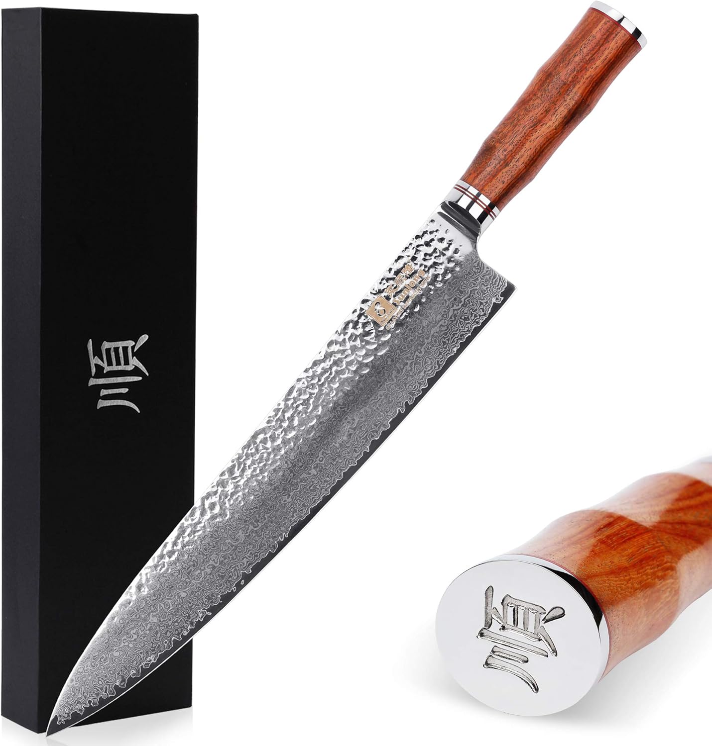 Best Chef’s Knife Buy VG10 Damascus Knives And High Carbon Knives!. The Damascus steel Knife is made of 67 layers of damascus The steel core adopts Japanese VG10, nonslip G10 handle, with high sharpness, corrosion Resistance, rust prevention and toughness which is very suitable for people who often cook or like the kitchen And Suitable as a gift for friends and family. Mosfiata Professional Chef Knife.
