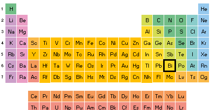 El bismuto tiene una toxicidad inusualmente baja para un metal pesado Sus vecinos de la tabla periódica, el polonio, el antimonio y el plomo son todos bastantes tóxicos, pero el bismuto es relativamente inofensivo Debido a esto, el bismuto está siendo investigado como una alternativa al plomo para algunas aplicaciones. El Bismuto es un metal;. En cuanto a la posición donde encontrar el bismuto dentro de la tabla periódica de los elementos, el bismuto se encuentra en el grupo 15 y periodo 6 El bismuto tiene una masa atómica de 8, u La configuración electrónica del bismuto es Xe4f14 5d10 6s2 6p3.