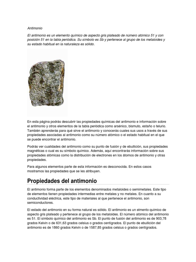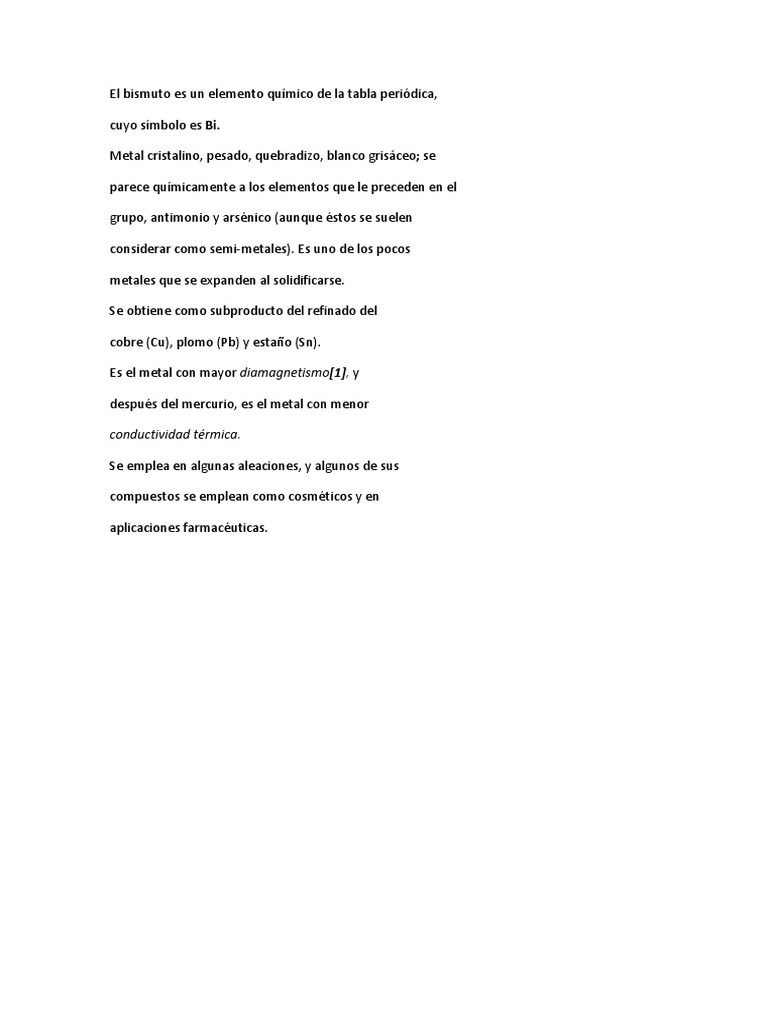 Se emplea en diversas aleaciones ;. Bismuto Elemento metálico, Bi, de número atómico y peso atómico 80, pertenece al grupo Va de la tabla periódica Es el elemento más metálico en este grupo, tanto en propiedades físicas como químicas El único isótopo estable es el de masa 9 Se estima que la corteza terrestre contiene cerca de % de bismuto. Es mal conductor de la electricidad y del calor ;.