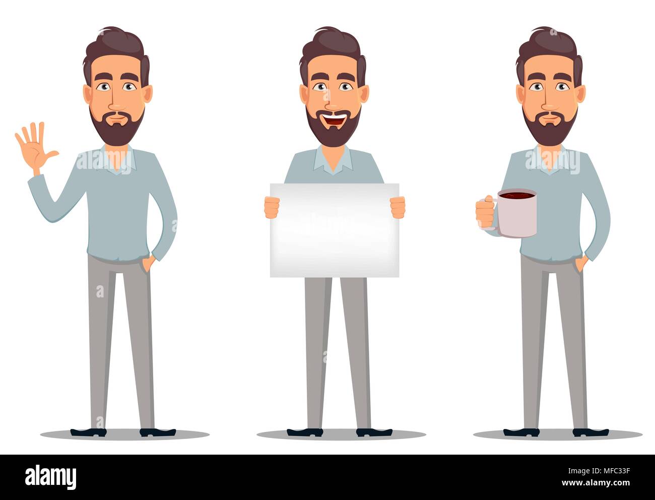 Hombre De Negocios De Ropa Informal Empresario Personaje De Dibujos Animados Con Etiqueta En Blanco Con Bebida Caliente Y Con Gesto De Saludo Ilustracion Vectorial O Imagen Vector De Stock Alamy