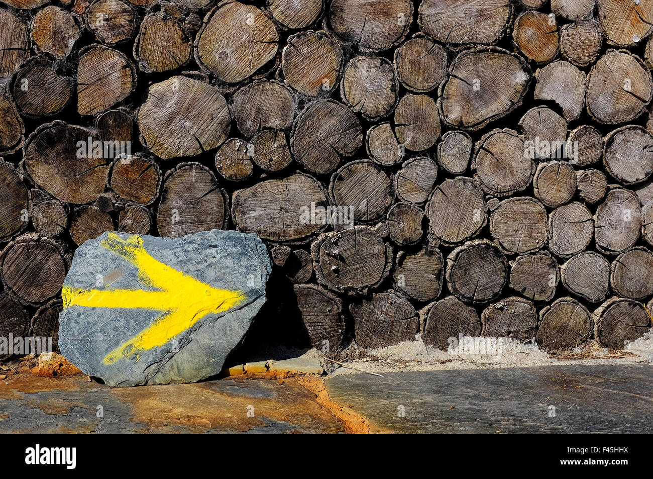 La Marca De La Flecha Amarilla Del Camino De Santiago Camino De Santiago En Pedrafita Do Cebreiro Galicia Espana Fotografia De Stock Alamy