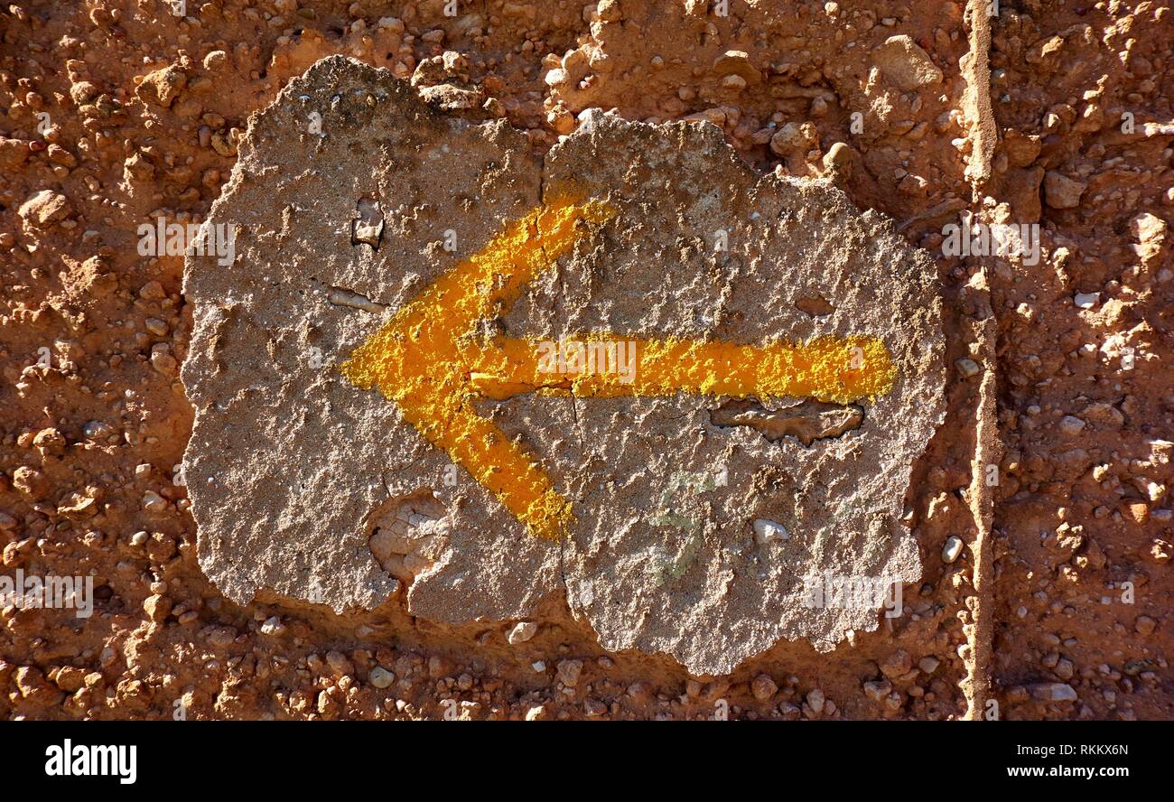 La flecha amarilla es, junto con la concha de vieira, uno de los símbolos más internacionales del Camino de Santiago ¿Te has preguntado alguna vez cuál es su origen?. Flecha Amarilla La Flecha Amarilla es otro de los Símbolos del Camino de Santiago de Compostela que te indicará la dirección que debes seguir Se trata de un símbolo indicativo La podrás encontrar en cualquier lugar como en un árbol, en el bordillo de una acera, en el pavimento de la carretera, en un muro, en una piedra, en una fachada, en un mojón dónde menos te lo esperes ahí. IMAGEN Y SEÑALÉTICA DEL CAMINO DE SANTIAGO APLICACIÓN DE FLECHA INDICADORA PARA HITO DE PIEDRA Se incorporara la flecha amarilla, indicadora del sentido de la senda Igualmente aplicada sobre fondo azul IMAGEN Y SEÑALÉTICA DEL CAMINO DE SANTIAGO APLICACIÓN DE FLECHA.
