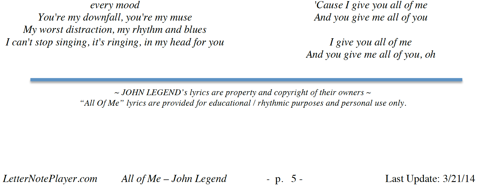 All Of Me John Legend Lyrics And Notes For Lyre Violin Recorder Kalimba Flute Etc