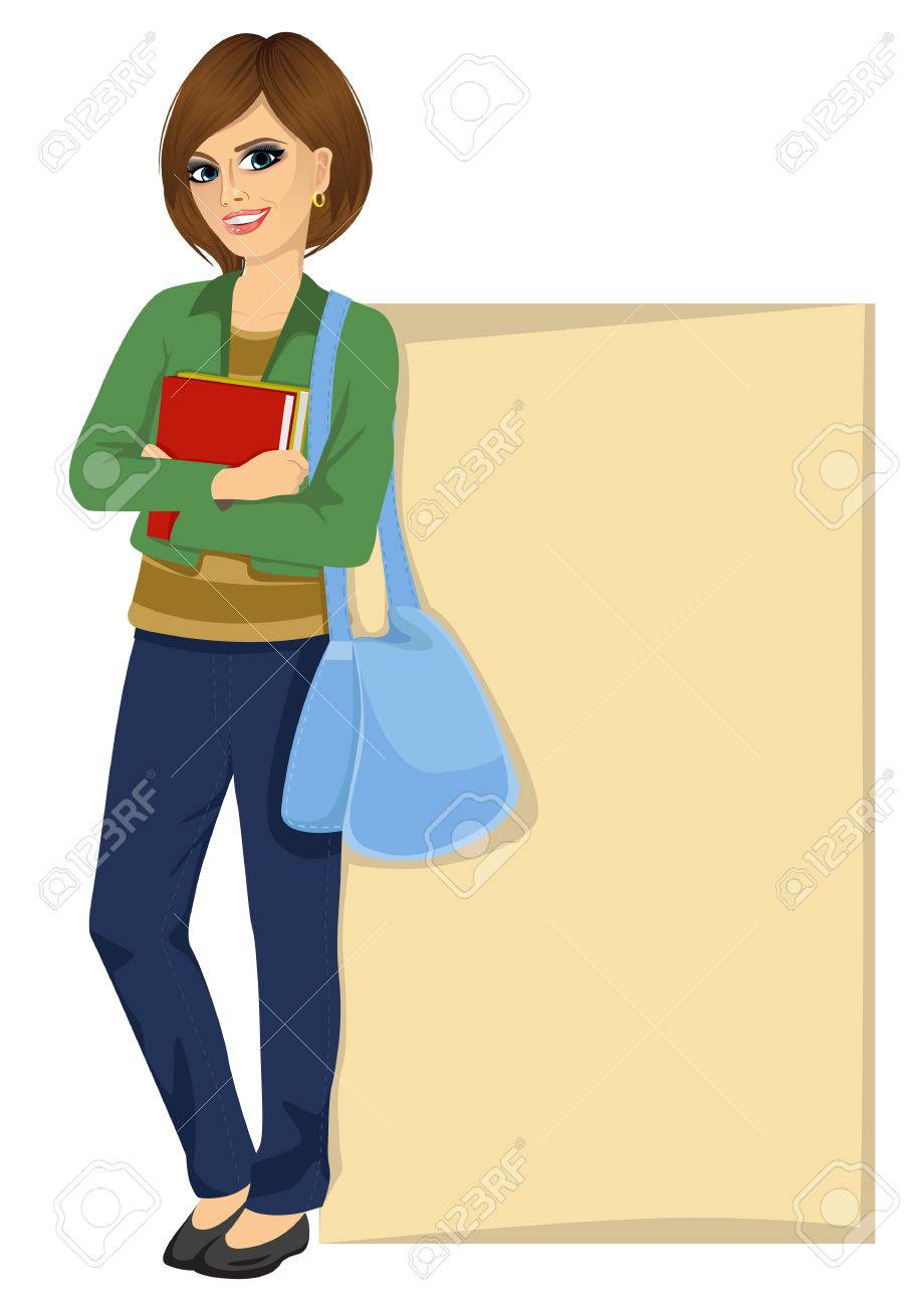 Estudiante Universitaria Con La Bolsa De Libros De Explotacion Y Apoyado En Una Tarjeta En Blanco Ilustraciones Vectoriales Clip Art Vectorizado Libre De Derechos Image