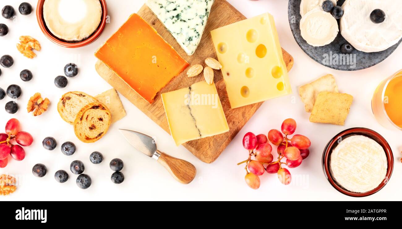 Fuente De Queso Una Bandera Panoramica Plana Sobre Un Fondo Blanco Queso Azul Leicester Rojo Emmental Queso De Cabra Brie Y Otros Tirado Desde Arriba Fotografia De Stock Alamy