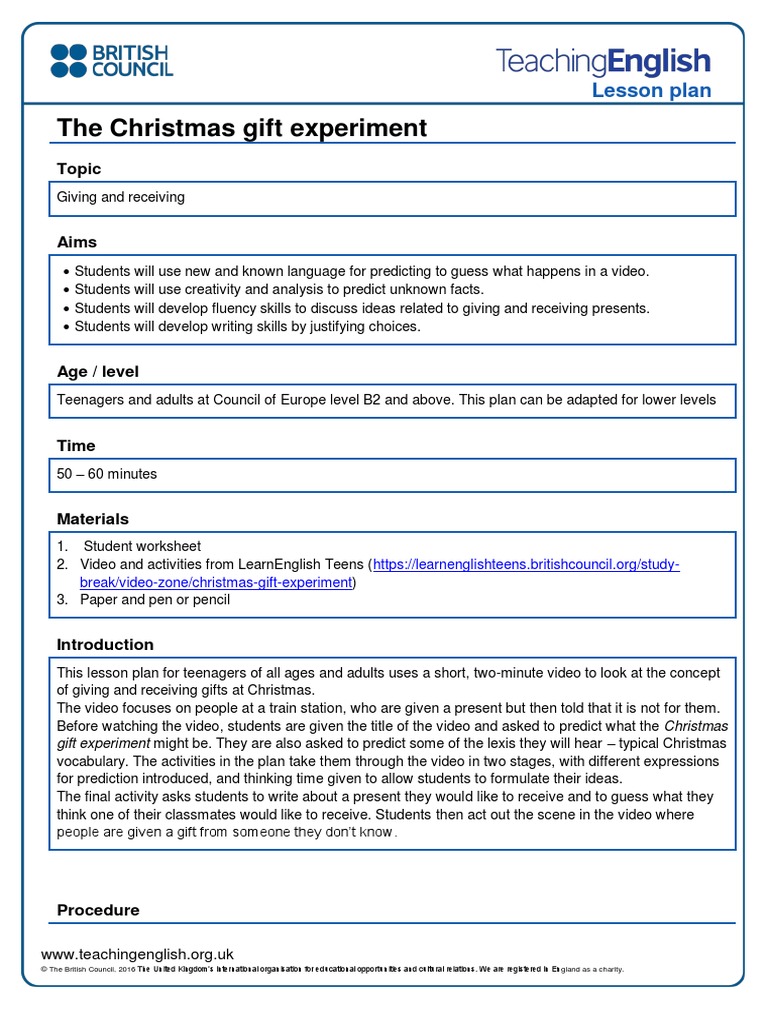 Teacher Notes Christmas Gift Experiment Lesson Plan Reading Comprehension