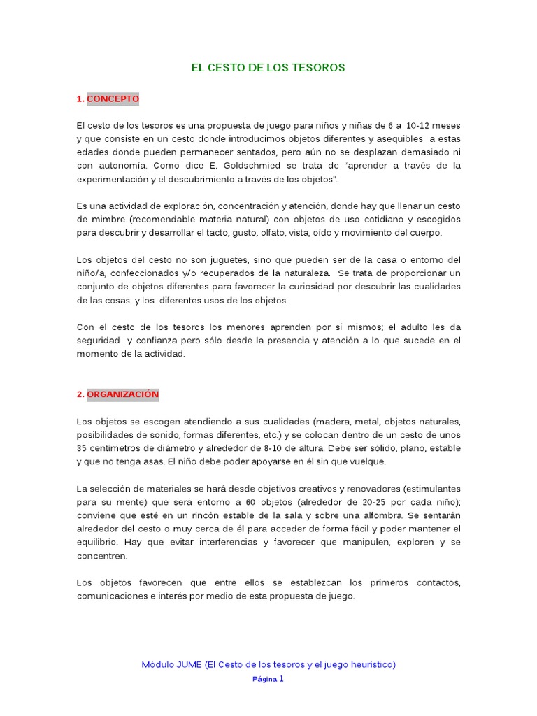La cesta de los tesoros y el juego heurístico 1 Actividades pedagógicas para nuestros peques de 0 a 2 años Jessica Forcadell La cesta de los tesoros El juego heurístico. Seguro que habrás observado mil veces, que tu bebé, a pesar de tener muchos juguetes a su alrededor, termina jugando con la cosa más absurda Se entretiene horas y horas (bueno quizás tanto no) con un ovillo de lana, con un cepillo de dientes o con una caja de latón. H oy os traigo una actividad de las fáciles, buenas, bonitas y baratas El cesto de los tesoros A nosotras nos encanta hacerla!.