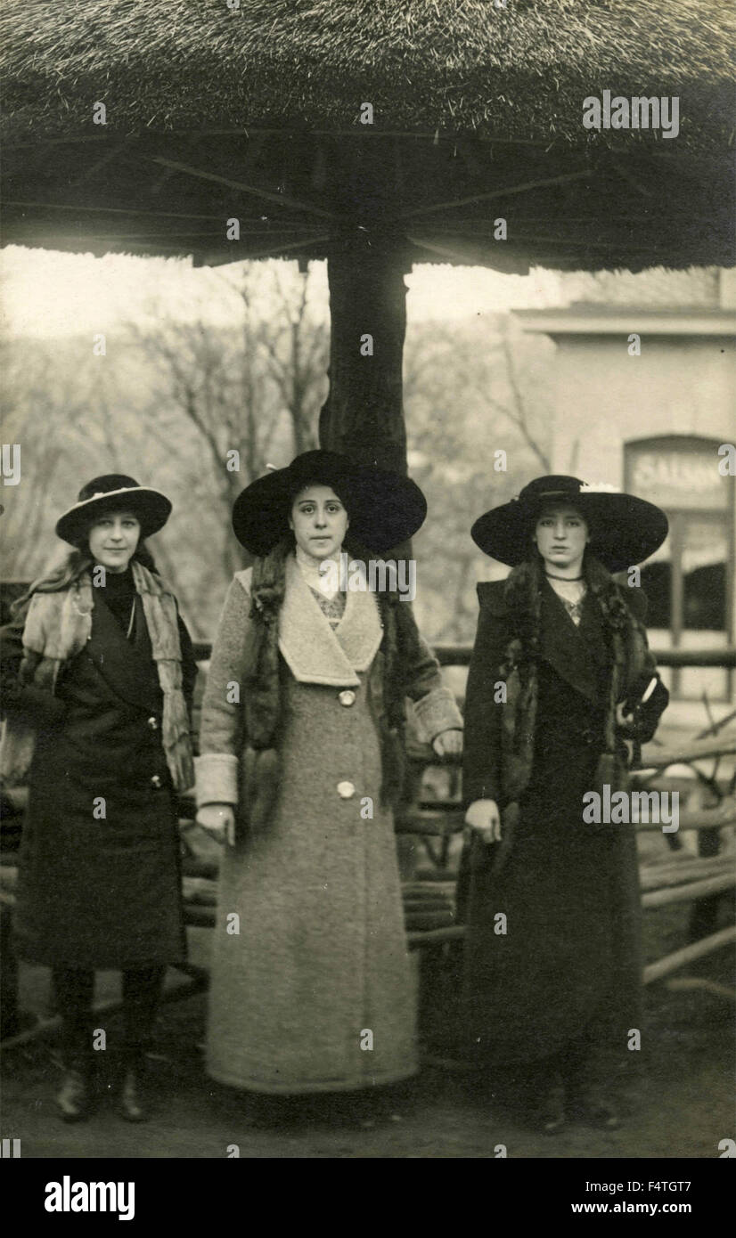 Tres Mujeres Con Grandes Sombreros Y Abrigos Largos Fotografia De Stock Alamy