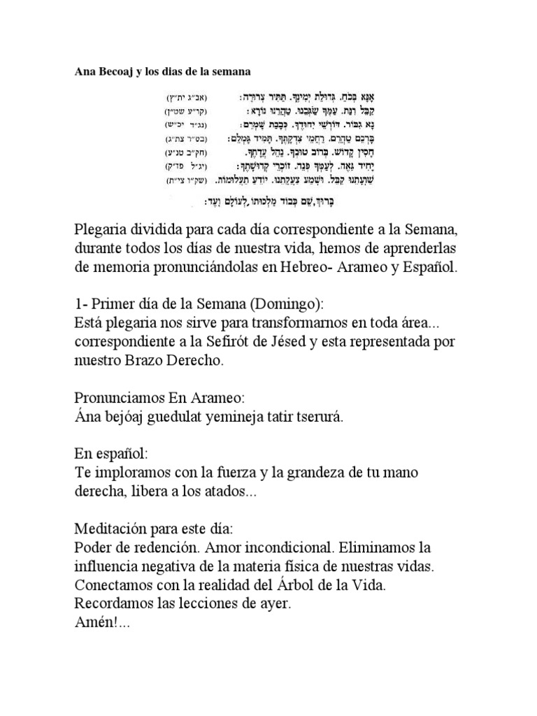 Pueden descargar en PDF para imprimir el Ana Becoaj con las frases de cada día de la semana y con las sefirot con explicación y meditación (escanear de derecha a izquierda) Descargalo aquí Ana Becoaj en hebreoinglés Charla y meditación de Ana Becoaj por Kabalah Aplicada y Javier Wolcof. Ana, a 1996 album by Ralph Towner;. La oración se recita en hebreo, de derecha a izquierda, como está a continuación "La oración del Aná Bejóaj es considerada como una de las oraciones más poderosas para conectarnos con el poder de la Creación" El Aná Bejóaj está oculto en las primeras 42 letras del Libro de Génesis, comienza con la palabra bereshit y termina con.