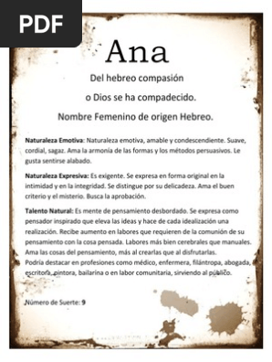 Arts and entertainment Ana, a Portuguese film;. El nombre de Ana es muy conocido en el mundo cristiano El significado bíblico de Ana lo sitúa en una mujer que quería fuertemente tener un hijo ( sobretodo varón ) al ser esteril le resultaba imposible, una noche casi sin esperanzas, le pidió a Dios con todas sus fuerzas tener un hijo, y en caso de tenerlo, dijo que se dedicaría su hijo. Alumno finalizó unidad hace 27 minutos Estudiante Ana Rivera Arcenio terminado la unidad en curso ¿Como presentarse en Hebreo?.