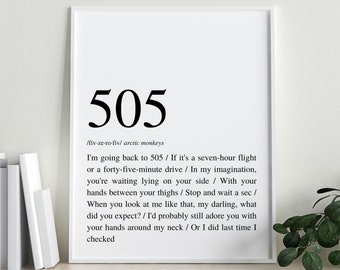 I'm going back to 505 If it's a seven hour flight Or a fortyfive minute drive In my imagination You're waiting lying on your side With your hands between your thighs But I crumble completely when you cry It seems like once again you've had to greet me with goodbye I'm always just about to go and spoil the surprise Take my hands off of your eyes too soon. Arctic Monkeys '505' Arctic Monkeys Lyrics poster, Arctic Monkeys poster, Arctic Monkeys Wall Art, Arctic Monkeys Quotes, Wall Art, decor Price $459 Original Price $540 Loading In stock You save $081 (15%) Sale ends in 23 hours Add to cart Whoa!. Arctic Monkeys 505 Tune Lyrics Key Data 505 from Favorite Worst Nightmare turned viral quickly after its launch Sung by Arctic Monkeys, 505 has left hundreds mesmerized with its brilliance Lyrics by Alex Turner has performed a serious position in 505 success.