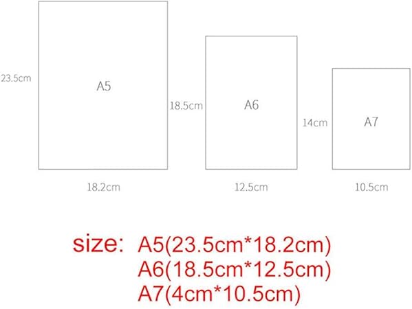 Dimensiones A5 148 x 21 cm Dimensiones A6 105 x 148 cm En Chíkidi Kawaii podrás encontrar paquetes de hojas de diferentes tipos y colores, así como separadores con pestañas y otros accesorios para personalizar tu carpeta con aros transparente y mantener todas tus notas muy bien organizadas. Adecuado para marcos de fotos tamaño A5 y A6 de 6 agujeros, lo que te ayuda a organizar álbumes e indicar la fecha de grabación Orden de página de índice ajustable La página del separador puede ajustar su orden de acuerdo a sus deseos, puedes poner la página que te gusta en la parte superior. El papel de tamaño se utiliza a menudo para las cartas, revistas, formularios y catálogos europeos y máquinas impresoras Es el tamaño usado más comúnmente El A5 se utiliza principalmente para cuadernos y libros de bolsillo Organización Internacional de Estandarización La relación altura/anchura del sistema de papel A es constante.