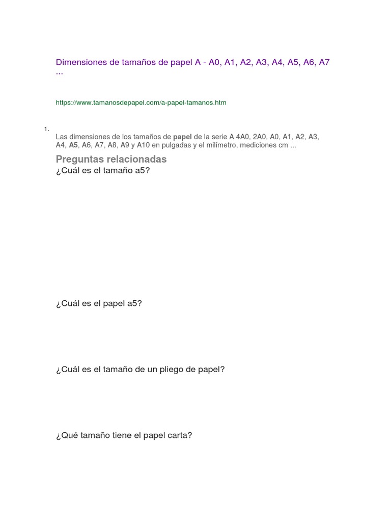 A5 A6 105 X 148 mm 1050 X 1480 cm 010 X 015 m 413 X 5 pulgadas X pinta 2480 X 3496 PC 1240 X 1748 PX 74 X 105 mm 740 X 1050 cm 007 X 015 m 291 X 413 pulgadas 979 X pinta 1748 X 2480 PC 874 X 1240 PX. Conoce aquì las medidas de hojas de papel A0, A1, , A3, , A5, A6, , y A8 Tambien en oficio o tamaño carta. Aquí su dimensión en cm y mm Aunque vivimos en un mundo digital, los materiales impresos siguen formando parte de nuestra vida cotidiana Y cuando se trata de imprimir ese folleto, pancarta, plano, diagrama o incluso un documento en Word, es importante saber cuáles son las medidas de los papeles que vamos.